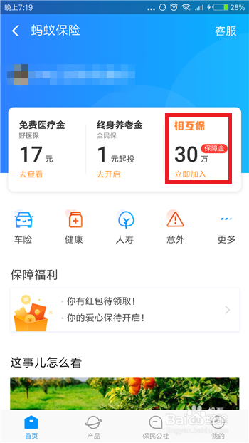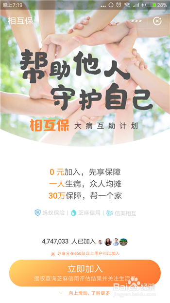 在蚂蚁保险的应用首页的顶部就可以看到【彼此保】,点击【当即插手】按钮。