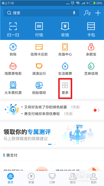 点击打开付出宝,在付出宝的首页中点击【更多】选项打开所有应用界面。
