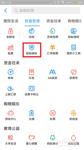 打开所有应用界面后,在【便平易近办事】的类别下方找到【蚂蚁保险】的应用并点击打开。
