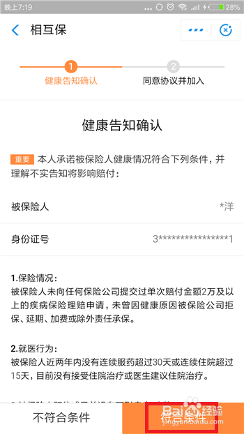 接下来会进入到健康奉告界面,彼此保的介入是需要必然前提的,确保知足前提后可以点击右下角的【合适前提】。