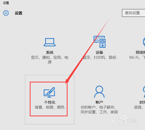 进入Win10系统设置页面之后,我们点击打开Win10系统中的“个性化”菜单设置页面,点击即可进入系统本家儿题个性化设置页面。