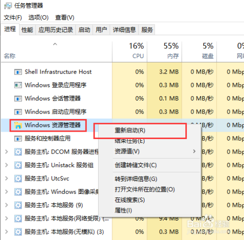 在Win10系统的使命办理器页面中,找到“Windows资本办理器”选项,对着该法式击右键,使其从头启动即可。