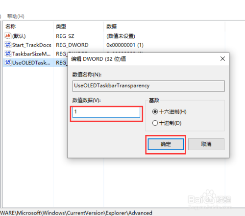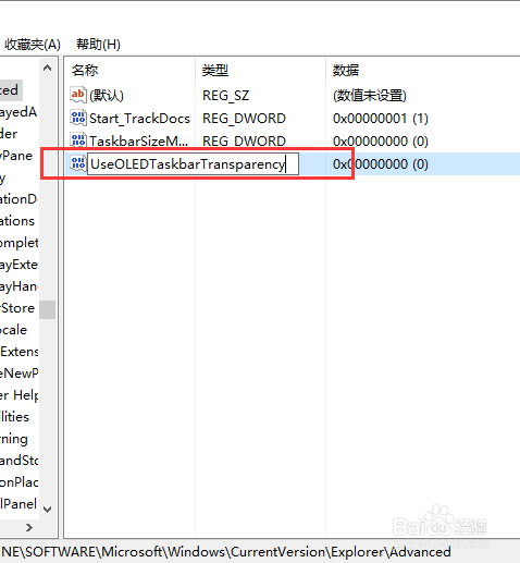 接下来,我们确定将新成立的DWORD(32位)值定名为“UseOLEDTaskbarTransparency”,我们可以对新成立的键值击右键进行点窜。