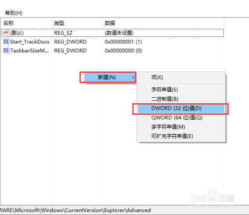 接下来,我们对着打开的Advanced子项右侧页面击右键,在弹出的菜单中选择“新建-DWORD(32位)值”。