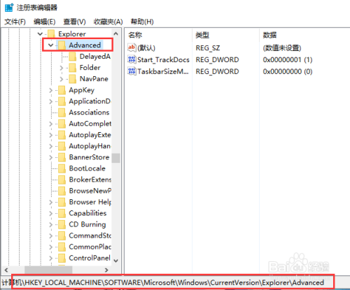 打开注册表编纂器页面之后,我们就可以依次双击打开左侧的菜单栏目,将注册表项定位至:HKEY_LOCAL_MACHINE\SOFTWARE\Microsoft\Windows\CurrentVersion\Explorer\Advanced