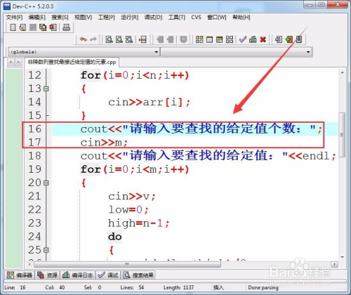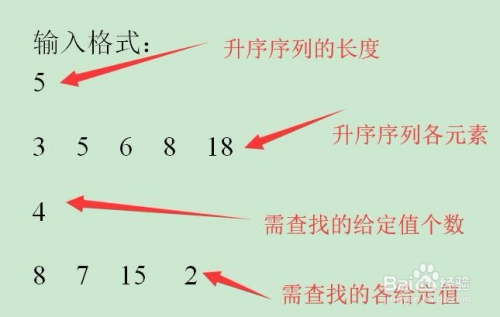 输入数据时,第1行输入升序数列的长度,第2行输入数列的各值,第3行输入需要查找的给定值个数,最后一行输入各查找的给定值。