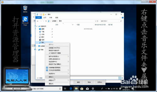 利用Windows+E快捷键调出资本办理器→右键点击音乐文件夹。