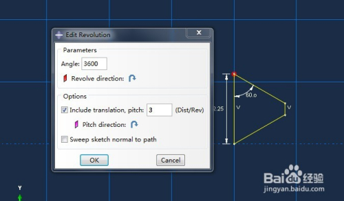 画好螺纹牙型截面图之后,点击鼠标中键进入实体参数设置,在弹出的窗口中输入扭转的角度为3600(十圈),include translation pitch设为3(螺距为3),点击ok,经由过程将牙型截面扭转获得螺纹线实体
