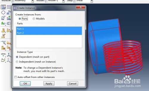 将成立好的螺纹实体与螺孔实体装配到一个部件实例上,利用assembly模块中的creat instance,在弹出的窗口中同时选中part1和part2,将两个实体装配到一个部件实例上