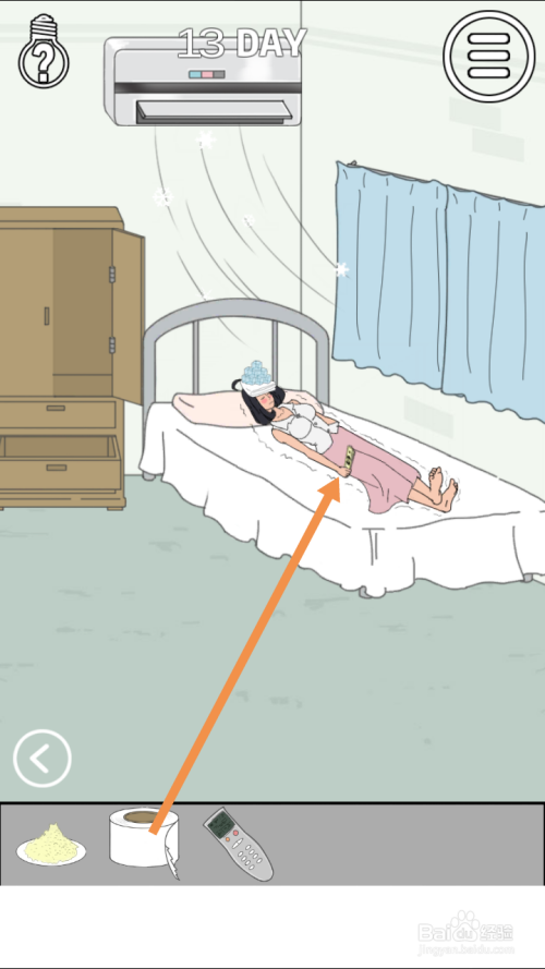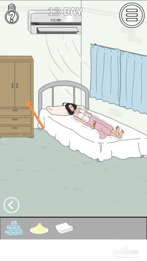 获得空调遥控器后,将毛巾拖动妻子头上,然后将冰块拖动到妻子头上。