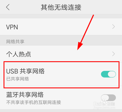 用USB数据线毗连好手机和电脑后,点击“USB共享收集”选项,可以看到已经当作功共享收集