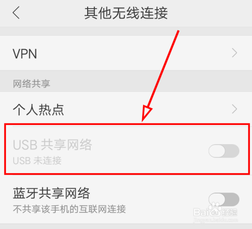找到“USB共享收集”选项,此时的选项为不成选,然后用手机的USB数据线把手机和电脑毗连起来