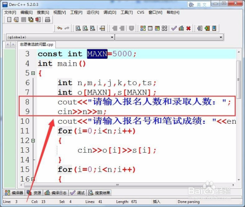 本例输入测试数据格局,第1行为报名人数和打算登科面试的人数,第2行之后为报名自愿者的报名号和笔试成就。