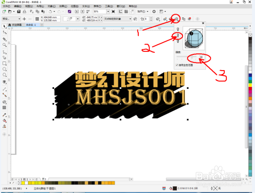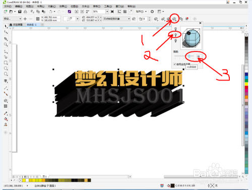 选中“梦幻设计师”字样,点击【立体化东西】,左上角方框中选择【立体左下】,做出立体结果。同样的步调,给“MHSJS001”字样也做出立体结果;