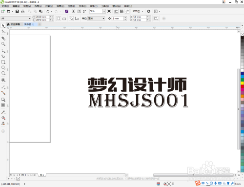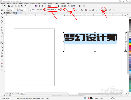 打开CorelDRAW X8软件,点击【文字东西】,在作图区拉出一个文本框,输入“梦幻设计师”字样。完当作后,对文字的字体、大小、颜色等参数进行设置(如图所示);