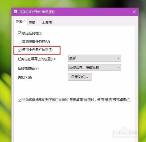 在属性页面中,我们可以看到使命栏显示小图标功能已经被启用,那么很有可能是因为这个才导致我们开启搜刮栏不当作功,那么我们点击将其打消勾选。