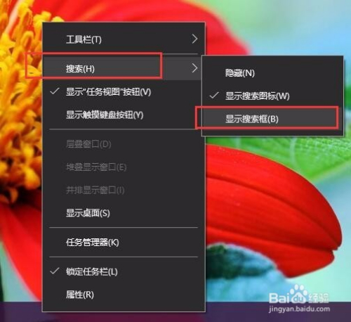 接下来,我们可以看到该设置中封闭了微软小娜的搜索框显示,这里我们点击选择“搜刮-显示搜索框”选项即可。