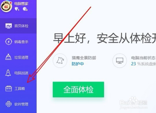 接下来在打开的电脑管家软件本家儿界面,我们点击左侧边栏的“东西箱”菜单项。