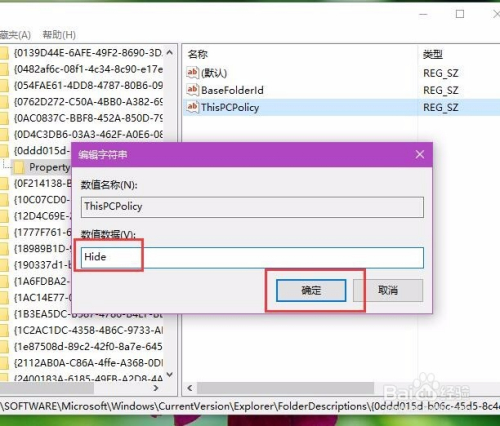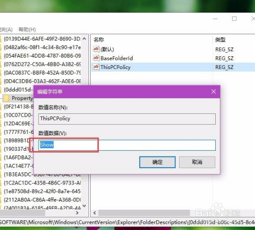 因为默认的键值为Show,若是我们想要将其埋没的话,可以将其子键值更改为Hide,然后点击确定按钮,保留对注册表编纂器的更改。