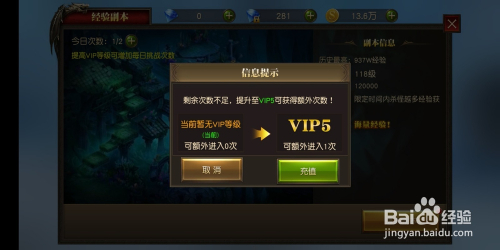 经验副本的游戏次数,玩家在游戏中若是是贵族5的话也是可以额外获得一次的挑战机遇!