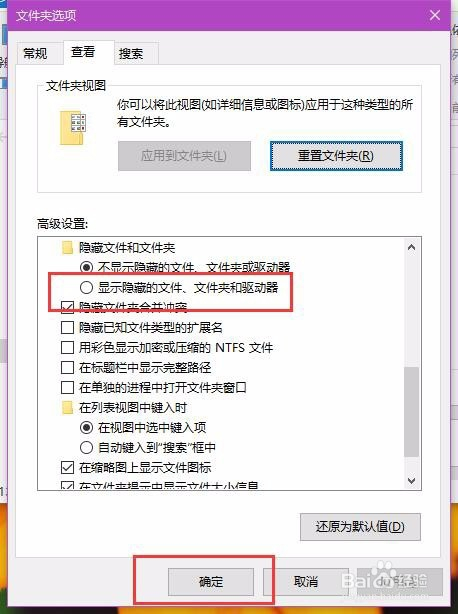 打开文件夹选项页面之后,点击页面中的“查看”选项,并点击选择许可查看埋没的文件夹和文件,并点击“确定”按钮。