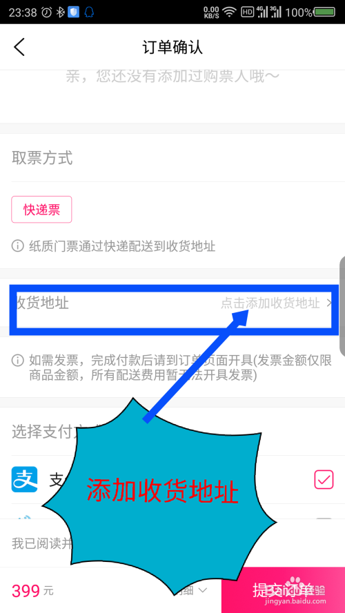 往下滑动屏幕,取票体例快递就可以了,点击添加收货地址,填错了票就没有了。如图所示
