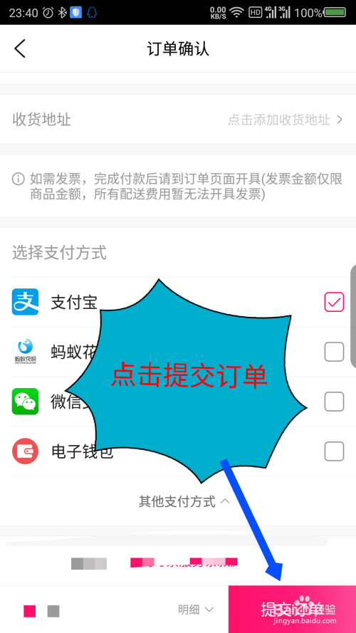 接下来就要选择付出体例了,选择好付出体例后,点击右下角的提交订单。如图所示