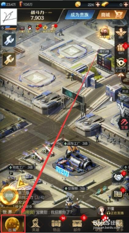 在游戏的本家儿界面中,左下角下有一个出城按钮,我们点击下它。如图所示。