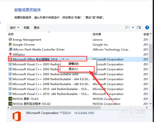 接下来,在打开的应用法式列表中找到在本台计较机中安装的Office 2016软件,然后对着该法式击右键,选择“更改”选项。