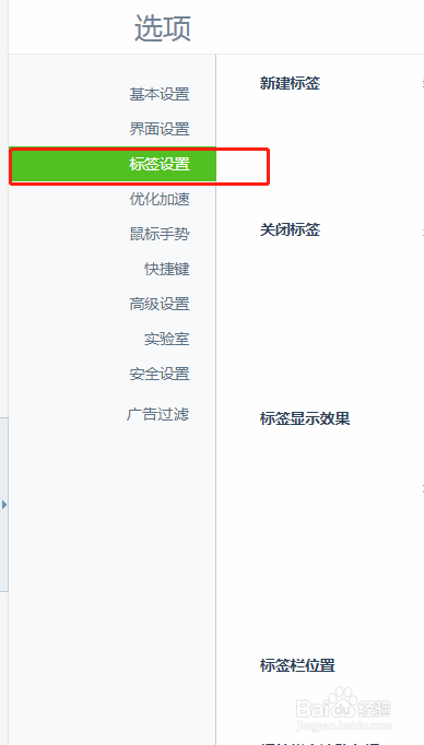 点击选项后谈弹出一个新的网页,在左侧的菜单中选择“标签设置”