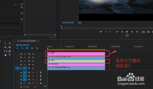 选中文本图形,按住alt键复制一份到视频轨道5上;打开结果窗口,搜刮选择轨道遮罩键结果,并将该结果施加到视频轨道4的视频媒体上。