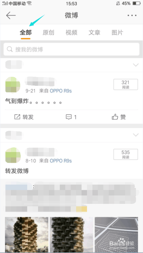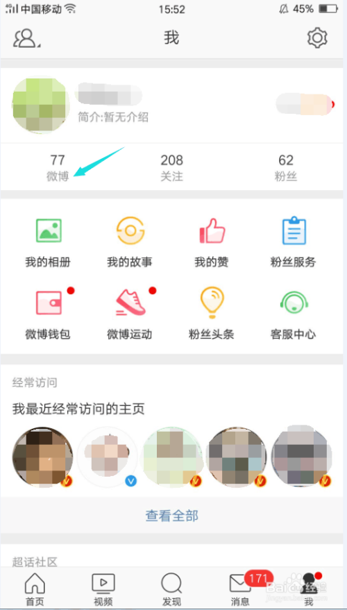 然后,在小我界面中,点击微博,你会看到你发布或转发的全数微博。