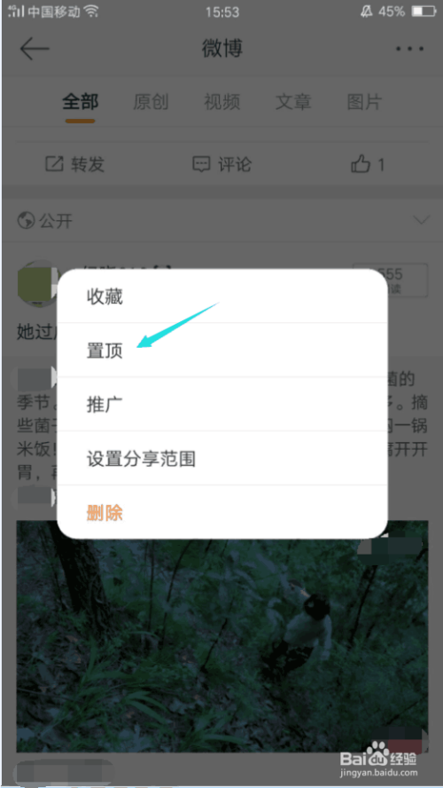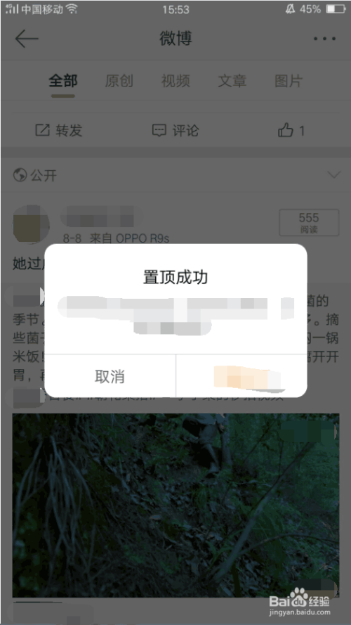 最后,在这个窗口中选择置顶,软件会提醒你置顶当作功,当下次打开你的微博本家儿界面时,你会发现该条微博在最顶处,而在这条微博的左上方也会呈现置顶的字样,你的微博就置顶当作功了。