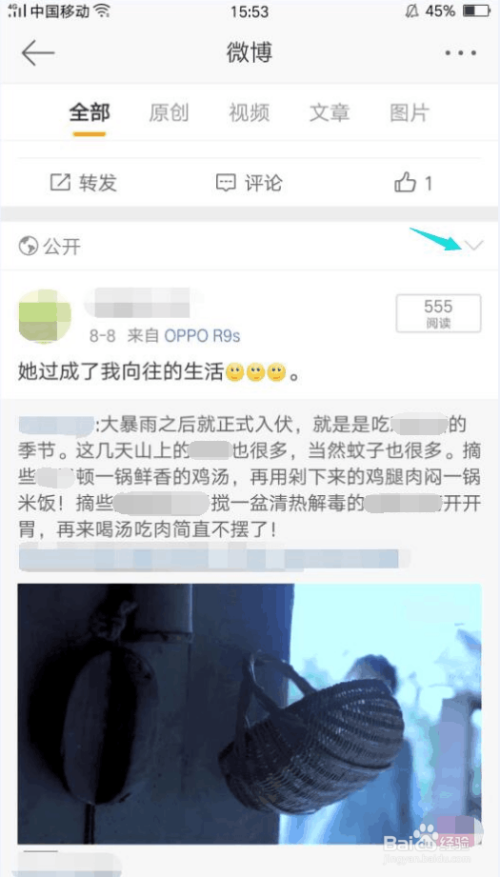 接着,找到你想设置当作置顶微博的微博,并点击该条微博右上角的“∨”图标,会弹出个窗口。
