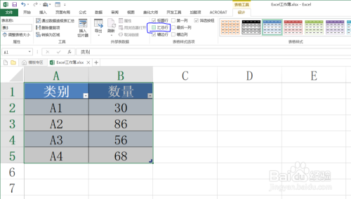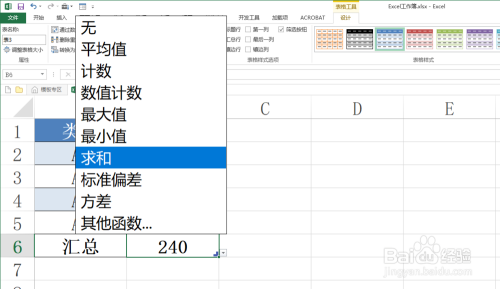 此时菜单栏中会多出设计项,在设计项表格样式选项功能区勾选汇总行号令。