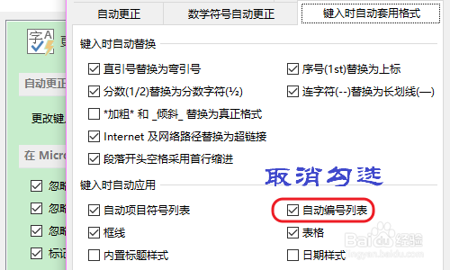 在校对对应的右侧页面里,我们勾选“主动更正选项”,然后找到键入时主动应用下方的“主动编号列表”,将此项打消勾选即可;