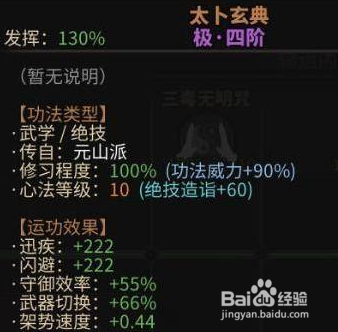 太卜玄典,被动类特技,正练结果为,削减施展技术的招式,不外起码也得一个,逆练结果为施展技术时劈式晋升攻速,刺式晋升移速,撩式晋升提气和架势。