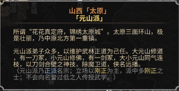 元山派为大小元山,该门派内部又分为两只,一向修道,助攻刀法,另一只为佛本家儿修剑法,两派手足同心,属于武林正道势力。