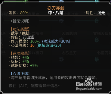 亦刀亦剑,被动特技,正练结果,战斗中切换兵器增添进犯速度,逆练结果,切换兵器时保留上件兵器的进犯速度,最好是正练。