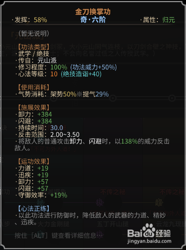 金刀换掌功,防御特技,正练结果,削减仇敌兵器的力道,精妙,迅捷,逆练结果,降低仇敌兵器的危险。
