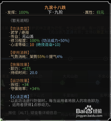 九滚十八跌,防御类特技,正练结果,防御仇敌进犯的时辰,每次当作功卸力城市获得一点移动力。逆练结果,获得的是移动力的移动效率。
