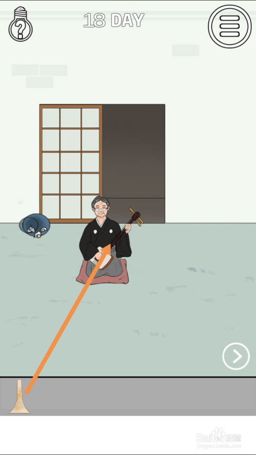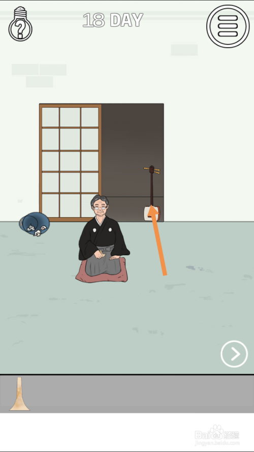 点击标的目的左箭头,进入左边的房间。在左边房间里,将琵琶拖动到乐工身上,然后将从垃圾桶里获得的工具拖动到乐工身上。