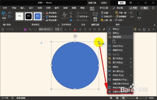 在外形中,我们选择“椭圆”外形,然后在word中按住键盘上的“shift”键绘制出一个正圆出来,接着选中该正圆单击鼠标右键,选择右键菜单中的“设置外形格局”。