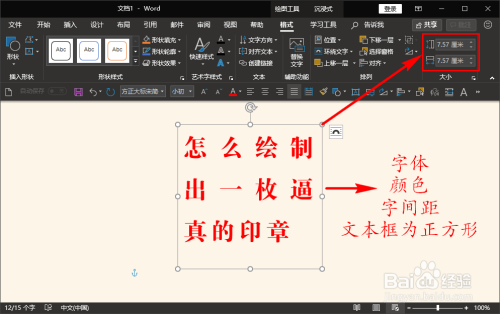 继续选中文本框,将文本框的字体设置为合适的字体,如宋体,再将字体的颜色设置为红色或者蓝色,调整好字体间距,将文本框的高度和宽度设置为一样,也就是将文本框设置为一个正方形。