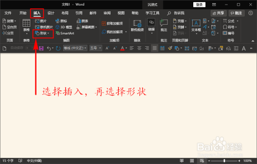 打开我们的word软件,然后在word文档顶部的菜单栏中找到“插入”菜单,再在插入子菜单里选择“外形”。