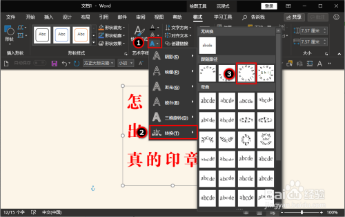 设置好之后,继续选中文本框,然后在顶部菜单栏新呈现的“格局”菜单中选择“艺术字样式”中的“文字结果”,继续选择其子菜单中的“转换”,再接着选择“转换”菜单下的“跟从路径”中的“圆”。