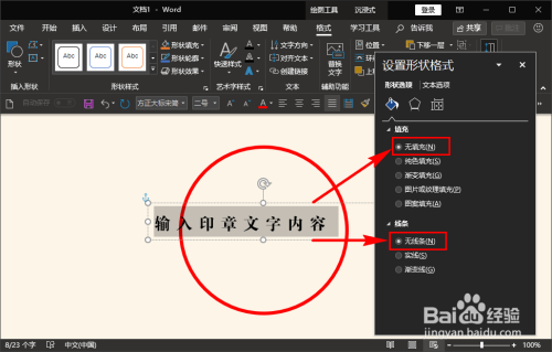 然后我们在文本框中输入我们想要的印章文字内容,选中文本框单击鼠标右键,选择右键菜单中的设置外形格局,将文本框设置为无填充和无线条。
