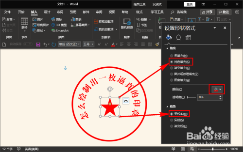 选中绘制出的正五角星,右键选择“设置外形格局”,将其设置为纯色填充,颜色选择为红色或蓝色,线条设置为无线条即可,最后调整好正五角星在正圆形中位置。