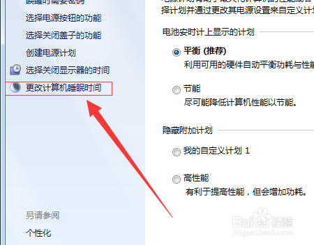 如许会进入到电源设置的一个界面,找到更改计较机睡眠时候,点击更改计较机睡眠时候。