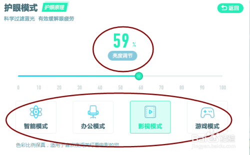 点开设置按钮可以设置亮度调节及四种模式供选择。按照本身的需要进行选择。